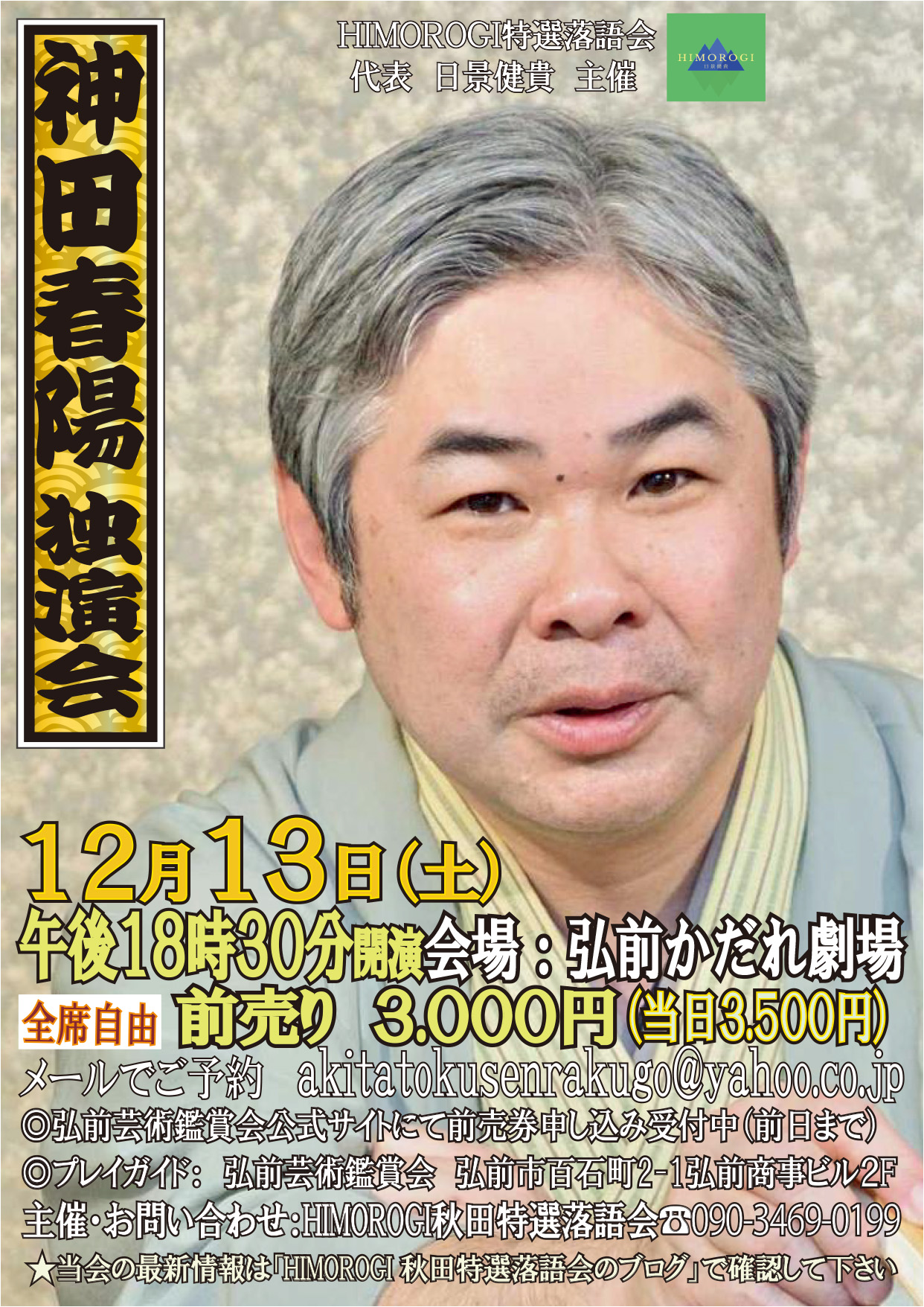 🔴神田春陽独演会<12月13日(土)18:30開演 入場料3,000円(当日/3,500円)>