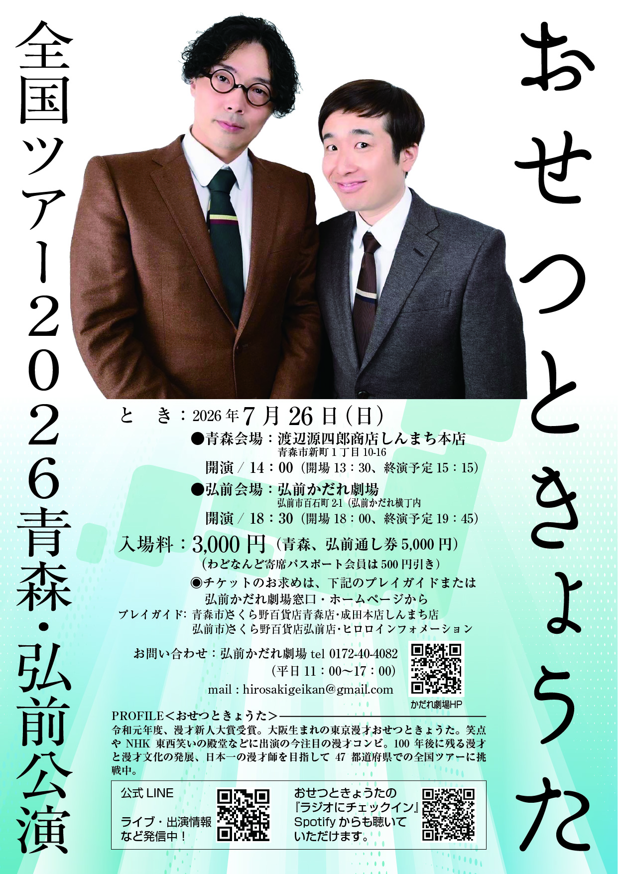🔴おせつときょうた全国ツアー 青森・弘前公演<7月26日(日)、青森:14:00〜/弘前:18:30〜(開場30分前)>
