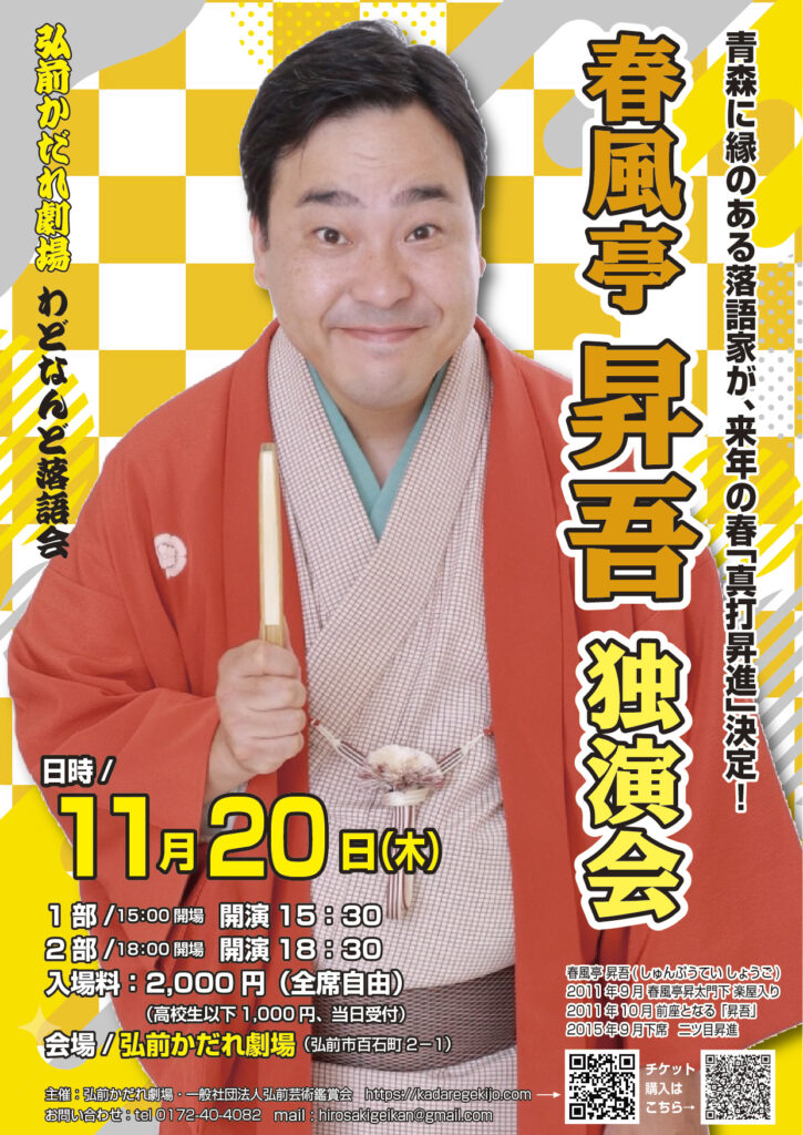 と き:2025年11月20日(木) 第1部:15:30開演 第2部:18:30開演ところ:弘前かだれ劇場入場料:前売 2,000円 (当日)2,000円