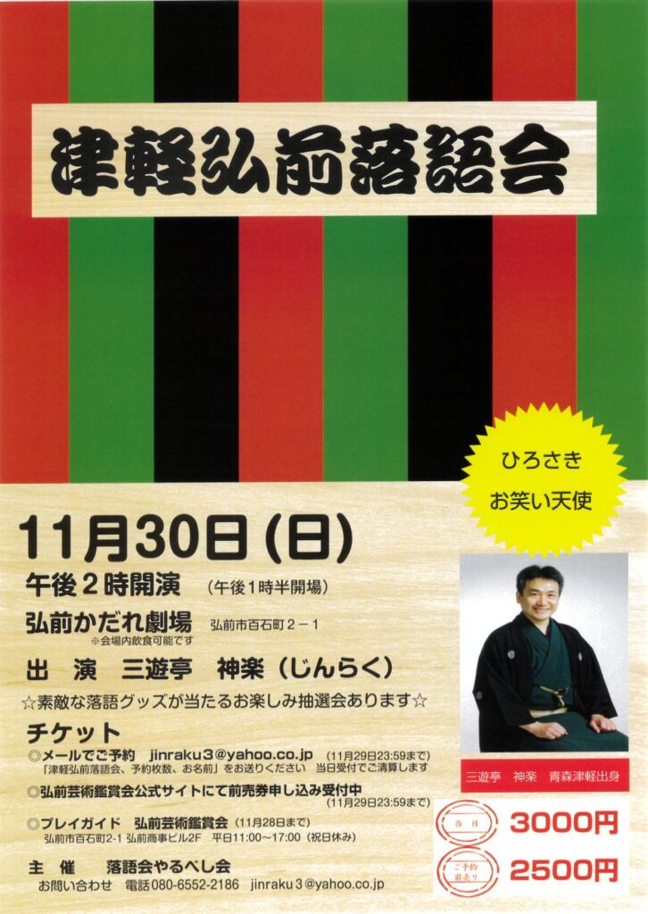 青森津軽出身の三遊亭神楽の落語をたっぷりとお楽しみください!素敵な落語グッズが当たるお楽しみ抽選会もあります。